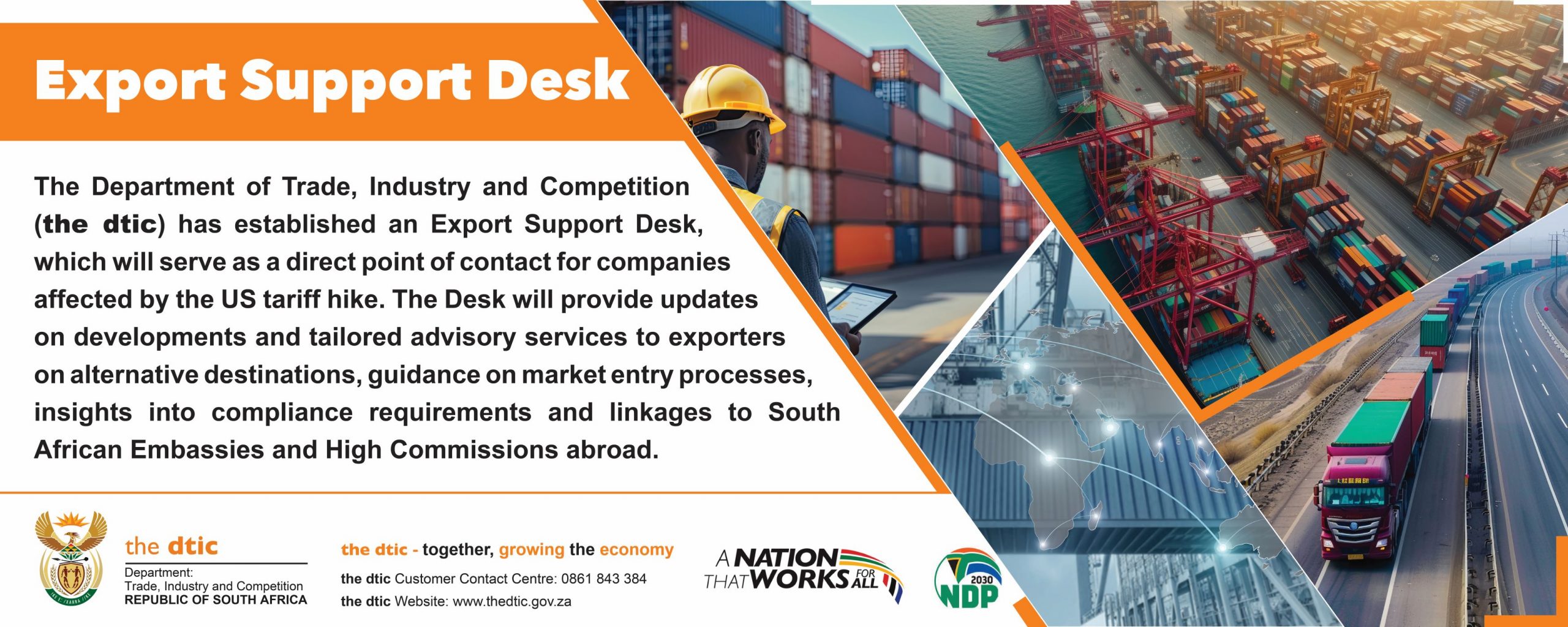 The Department of Trade, Industry and Competition (the dtic) has established an Export Support Desk, which will serve as a direct point of contact for companies affected by the US ...